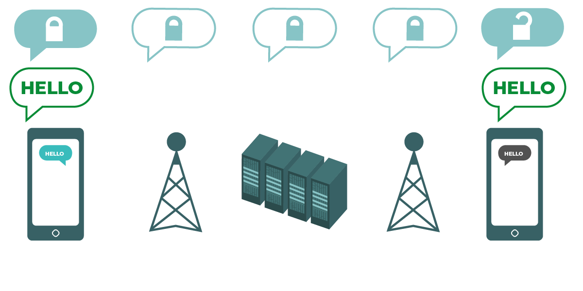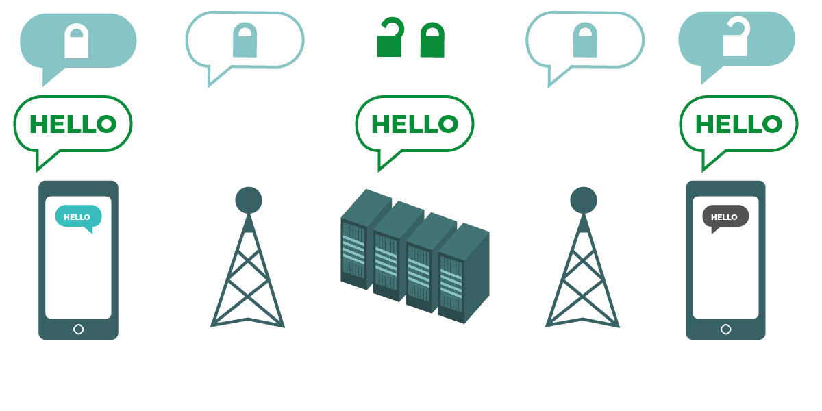 แผนภาพแสดงการเข้ารหัสในชั้นการขนส่ง สมาร์ทโฟนทางด้านซ้ายส่งข้อความ “Hello” สีเขียวที่ไม่ได้มีการเข้ารหัส ข้อความดังกล่าวจะถูกเข้ารหัส จากนั้นจะถูกส่งต่อไปยังหอสัญญาณโทรศัพท์มือถือ ตรงกลาง เซิร์ฟเวอร์ของบริษัทจะสามารถถอดรหัสข้อความ เข้ารหัสข้อความซ้ำอีกครั้ง แล้วส่งข้อความดังกล่าวต่อไปยังหอสัญญาณโทรศัพท์มือถือถัดไป ท้ายสุด สมาร์ทโฟนอีกเครื่องจะได้รับข้อความที่มีการเข้ารหัส แล้วถอดรหัสข้อความดังกล่าวเพื่อให้อ่านข้อความได้ว่า “Hello”
